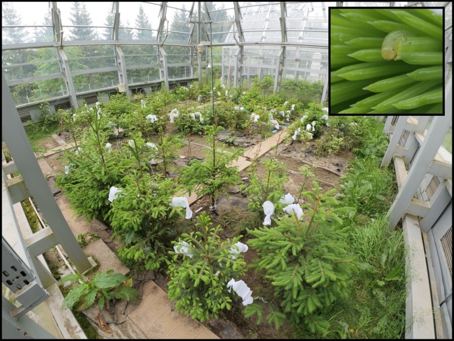 The influence of mycorrhizas on woody tree species concerning morphology, physiology and defence of deciduous trees against biotic and abiotic factors is studied under changing environment conditions. We published a method for trehalose determination by LC-MS/MS in spruce ectomycorrhizal roots to check the fungi infection in spruce caused by the pathogen, Gemmamyces piceae. Further, we used this method in other experiments to analyse non-structural carbohydrates of mycorrhizal fungi which are of importance in plant metabolism. The experiment covers the phytopathology input, physiological assessment of the trees, analysis of oligosaccharides in roots and needles, soil analysis and PCR method for fungi detection.